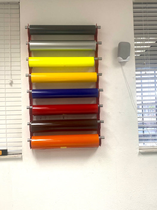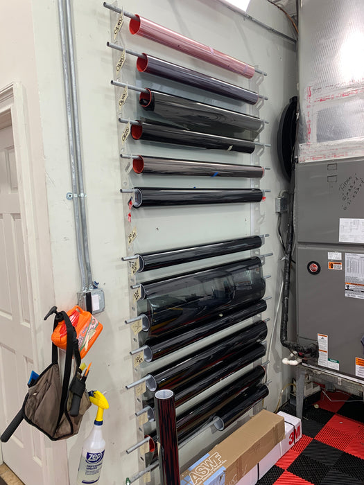 - Aluminum Tint Rack that holds 8 rolls of almost any tint material, including wrap vinyl or banner, (just mount to your desired width)